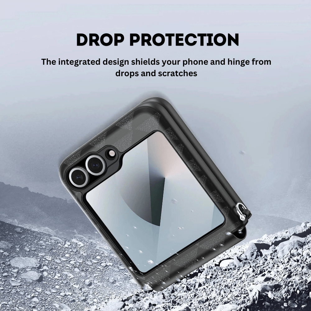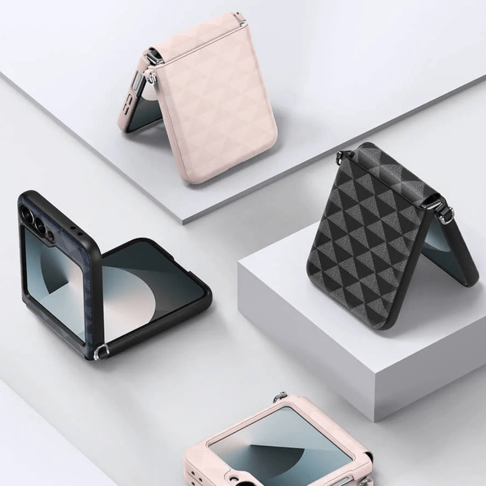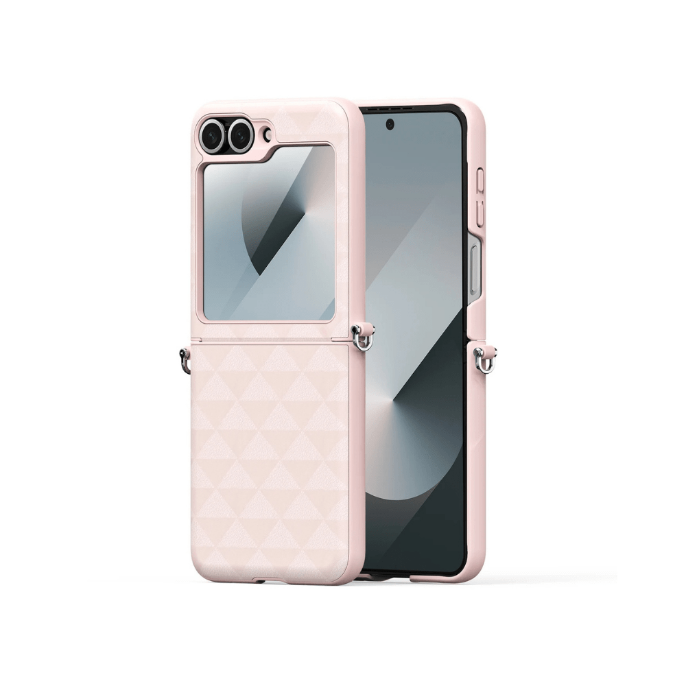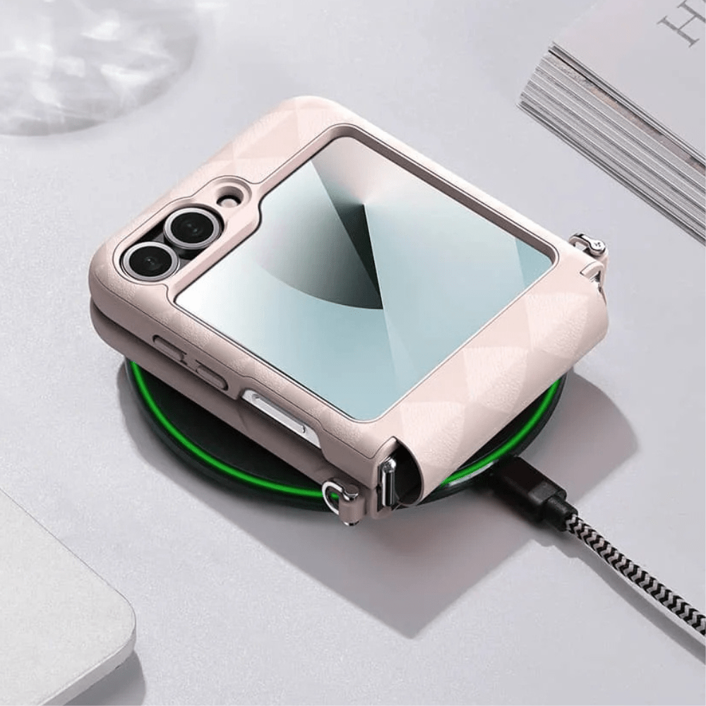 The case seamlessly folds with your phone, ensuring that the unique design of your Galaxy Z Flip 6 remains smooth and functional while offering robust protection. Its fashion-forward style doesn’t compromise practicality—with metal attachment loops to add straps or lanyards, and support for wireless charging so you never have to remove the case.