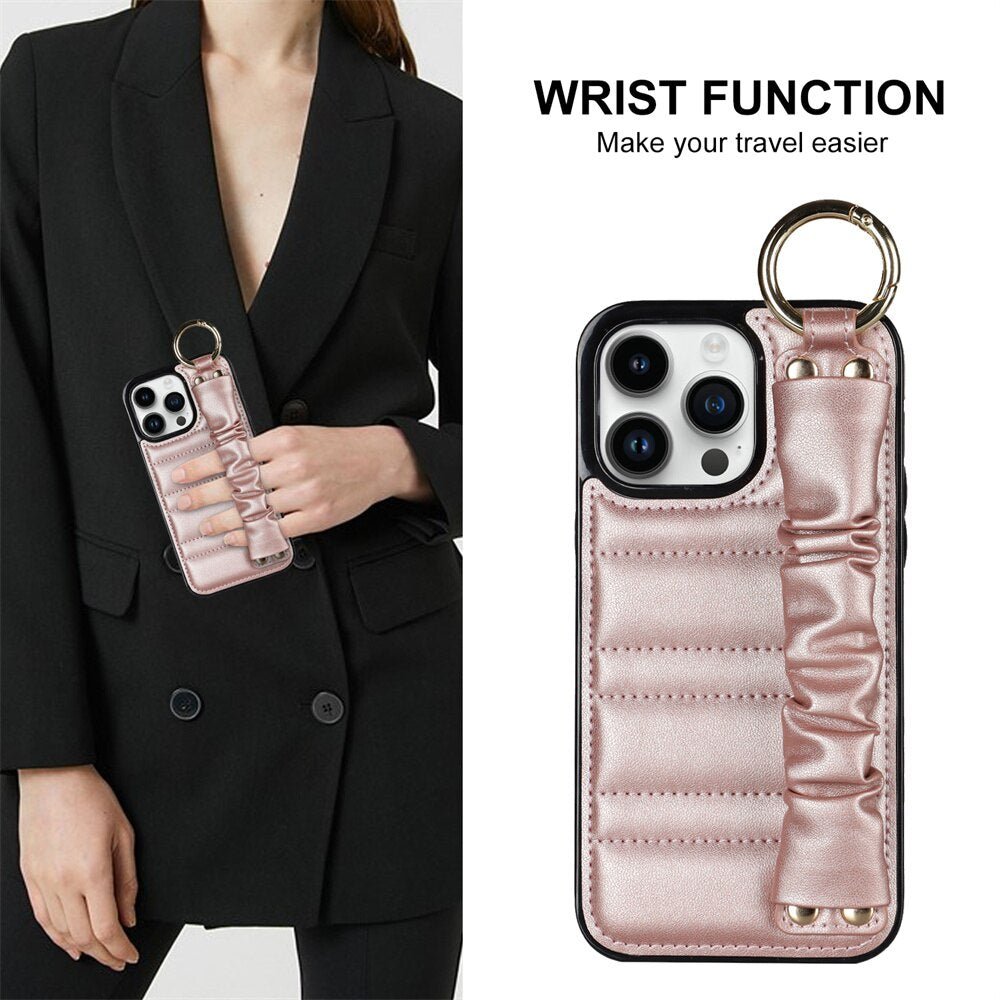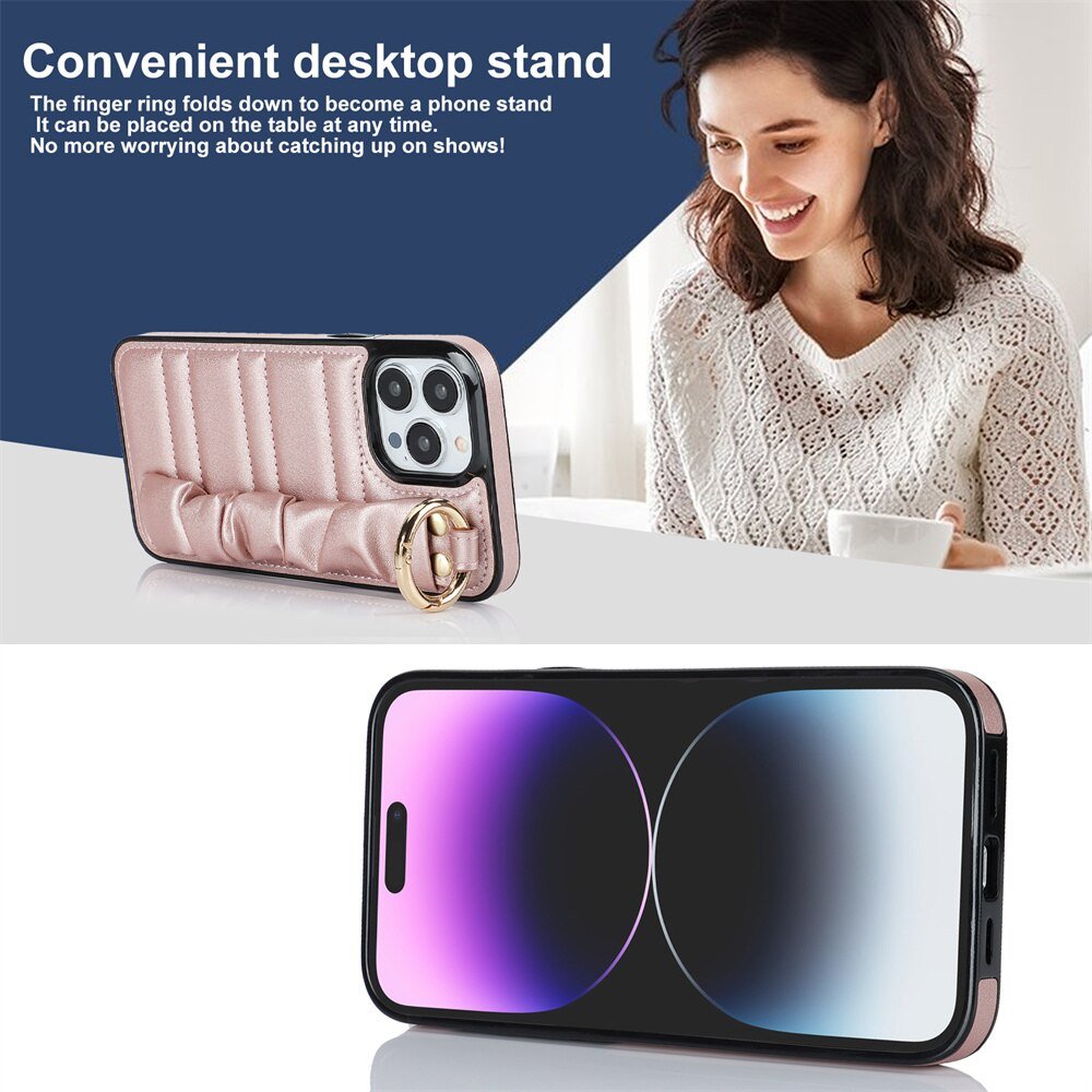 Enjoy peace of mind with the anti-drop and shockproof protection that this case provides. The metal ring, thoughtfully integrated into the case, folds out to serve as a phone stand. The pleated wrist strap not only improves grip but also enhances the overall portability of your iPhone.